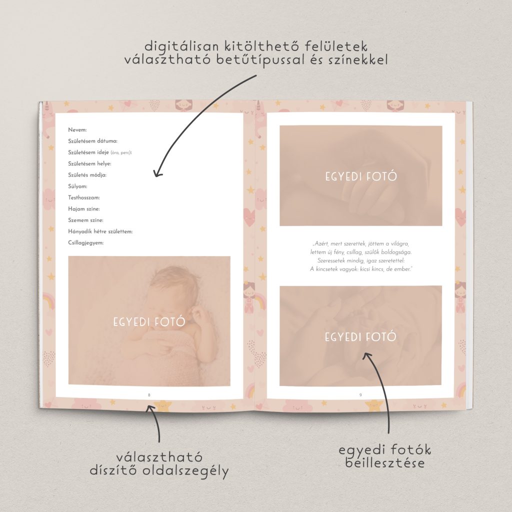Képzeld csak el: egy igényesen megszerkesztett, személyes napló, amely tartalmaz minden fontos pillanatot – a várandósság végétől az első mosolyon át egészen az első születésnapig. Egy ilyen offline változat örök emlék marad a család minden tagjának, de különleges meglepetés lehet például a nagyszülőknek is.